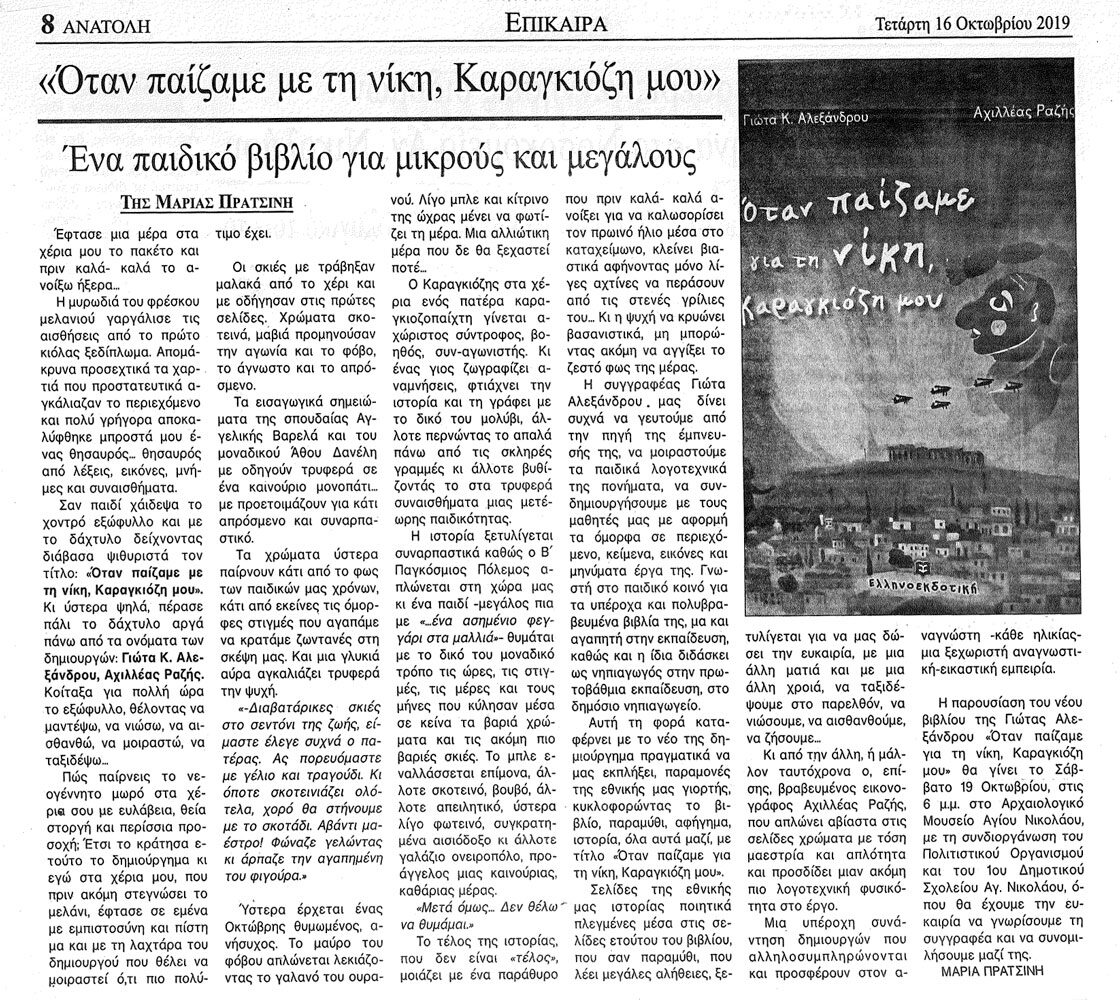 Μαρία Πρατσίνη, εφημερίδα ΑΝΑΤΟΛΗ, 16/10/19