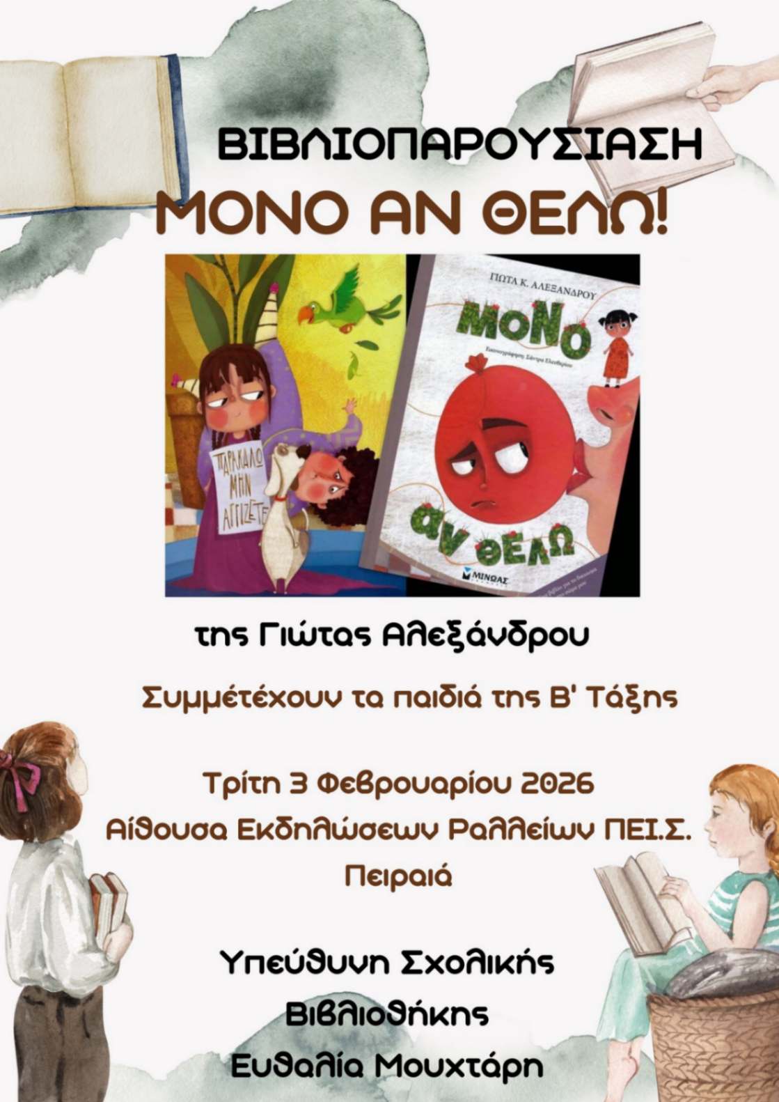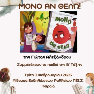 Στο πλαίσιο των δράσεων της Σχολικής Βιβλιοθήκης των Ράλλειων Πειραματικών Δημοτικών Σχολείων Πειραιά, η συγγραφέας Γιώτα Αλεξάνδρου συνάντησε όλα τα τμήματα της Β’ τάξης, με αφορμή το βιβλίο της “Μόνο αν θέλω”, που κυκλοφορεί από τις εκδόσεις Μίνωας.